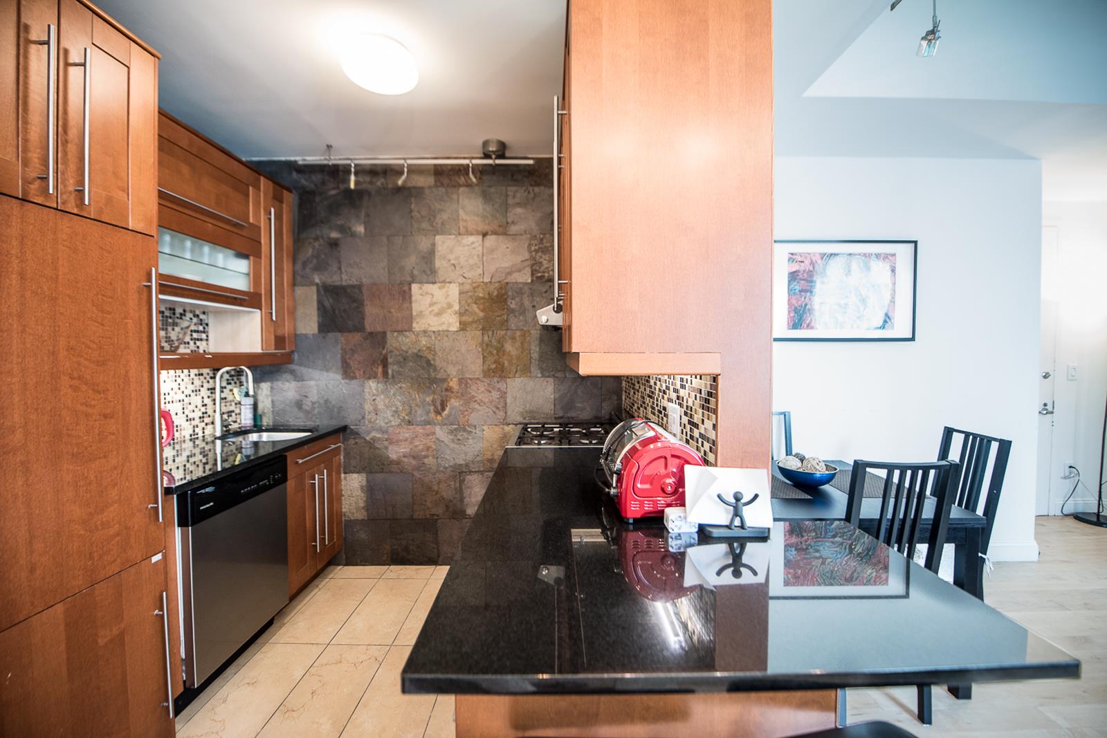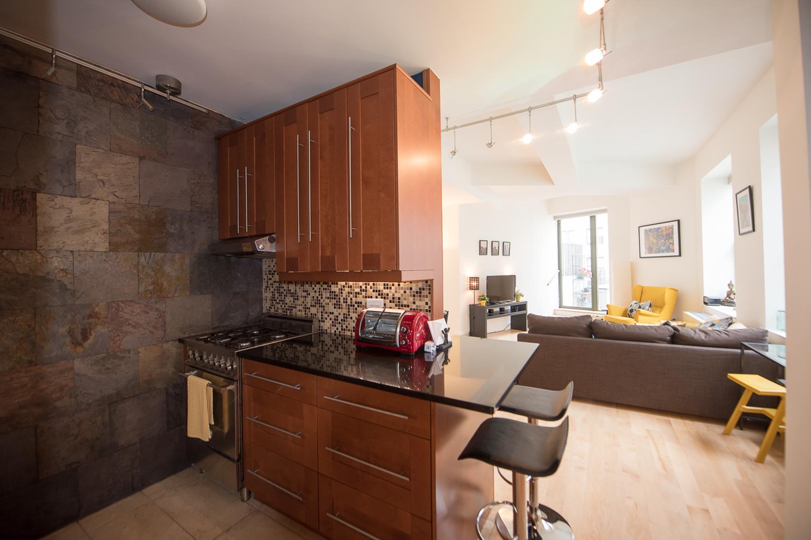 The building offers residents an array of amenities that include a full-time doorman, Zen garden, landscaped rooftop deck, fitness center, lounge with a fireplace, pool table, screening room, and kitchen.