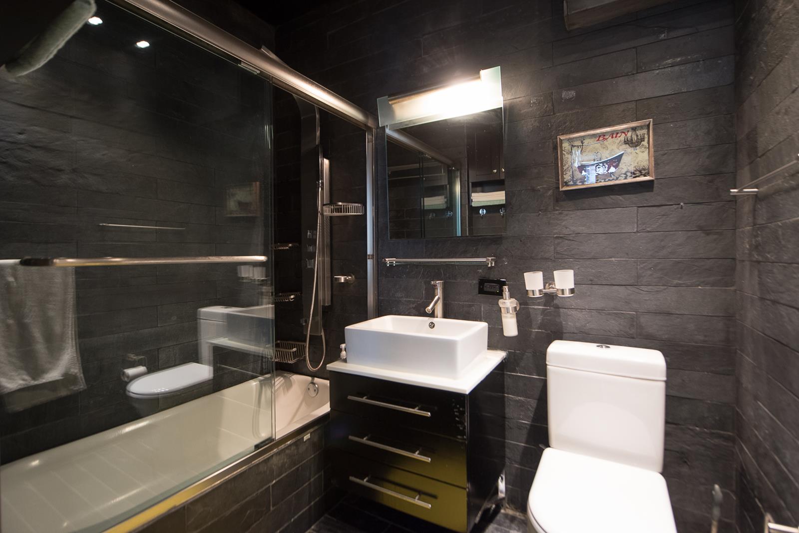 The serene marble bathroom is equipped with the latest modern fixtures.