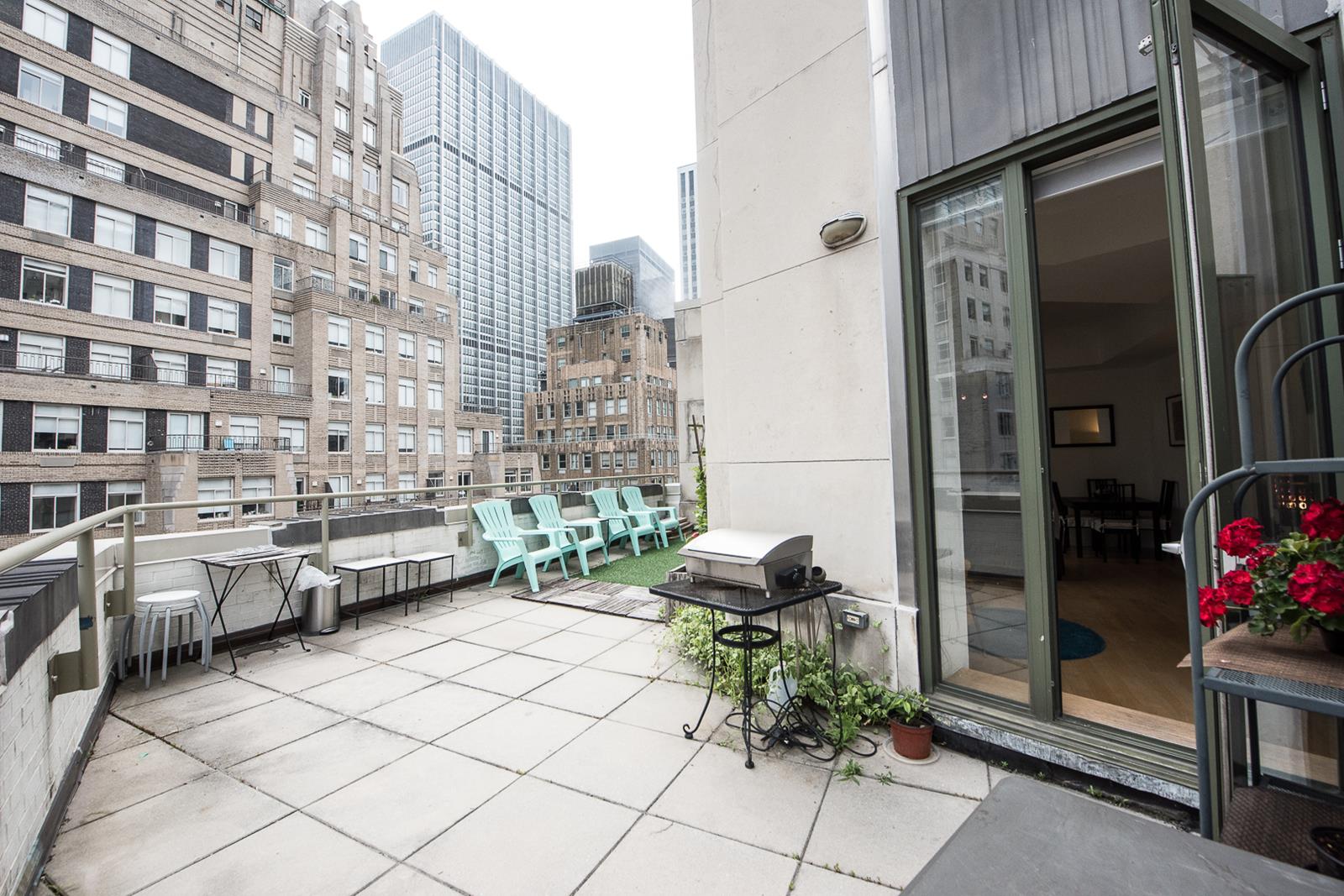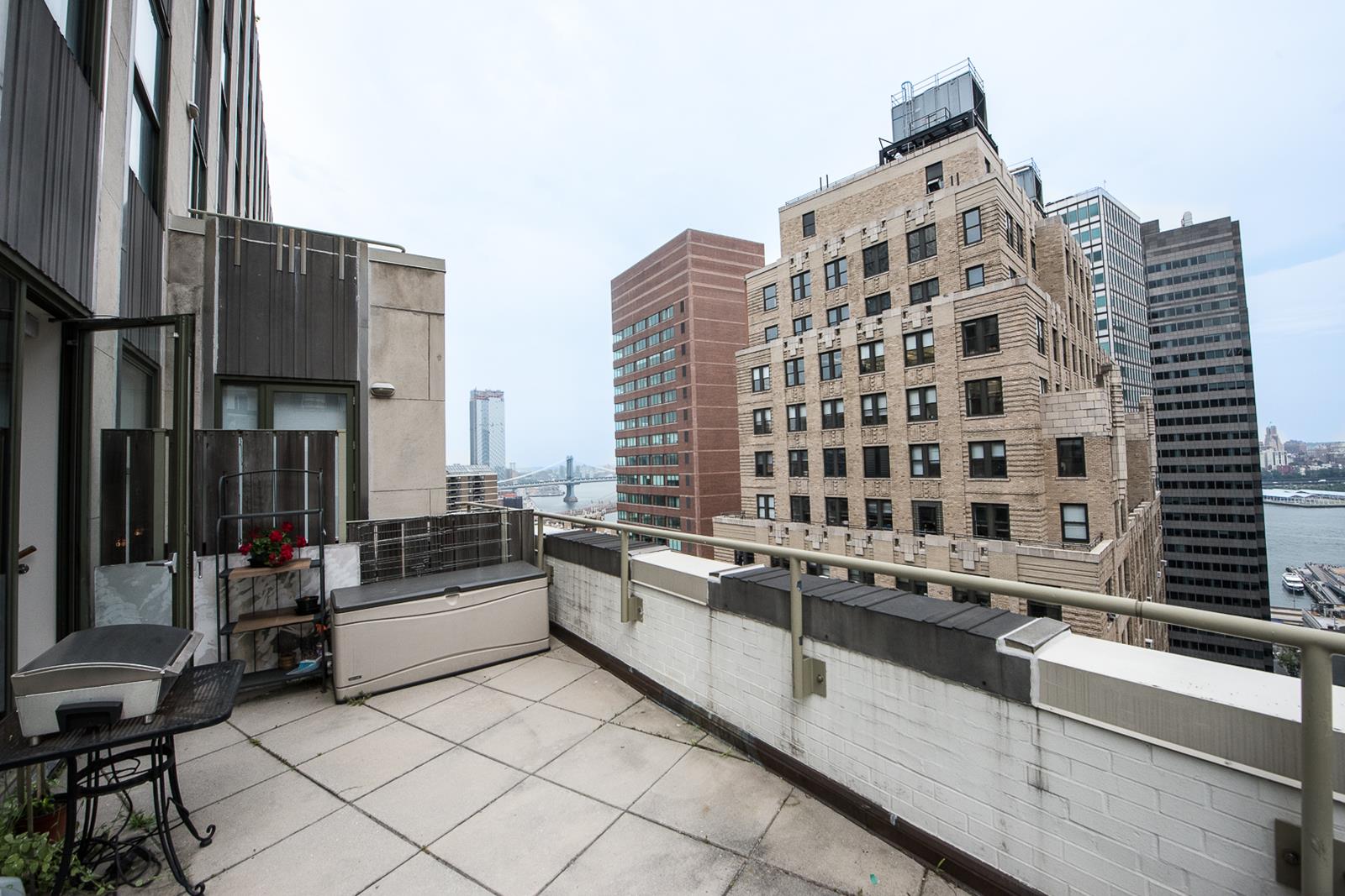 Rare and newly renovated corner 1BR with wide setback terrace and views from the East River to 1 World Trade Center.