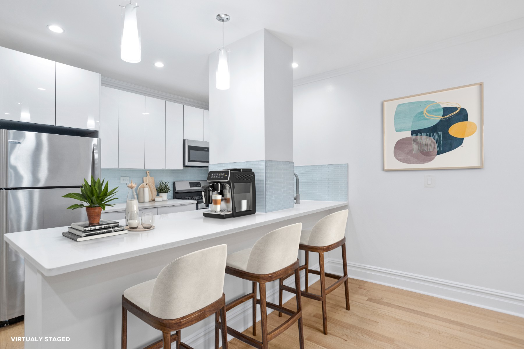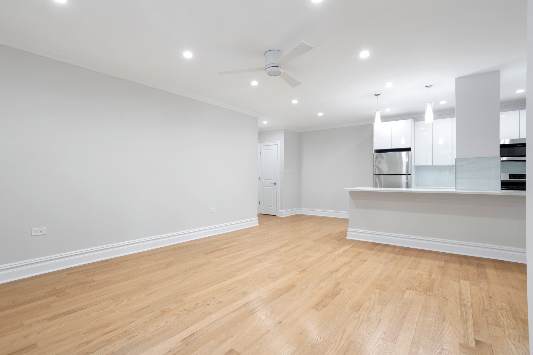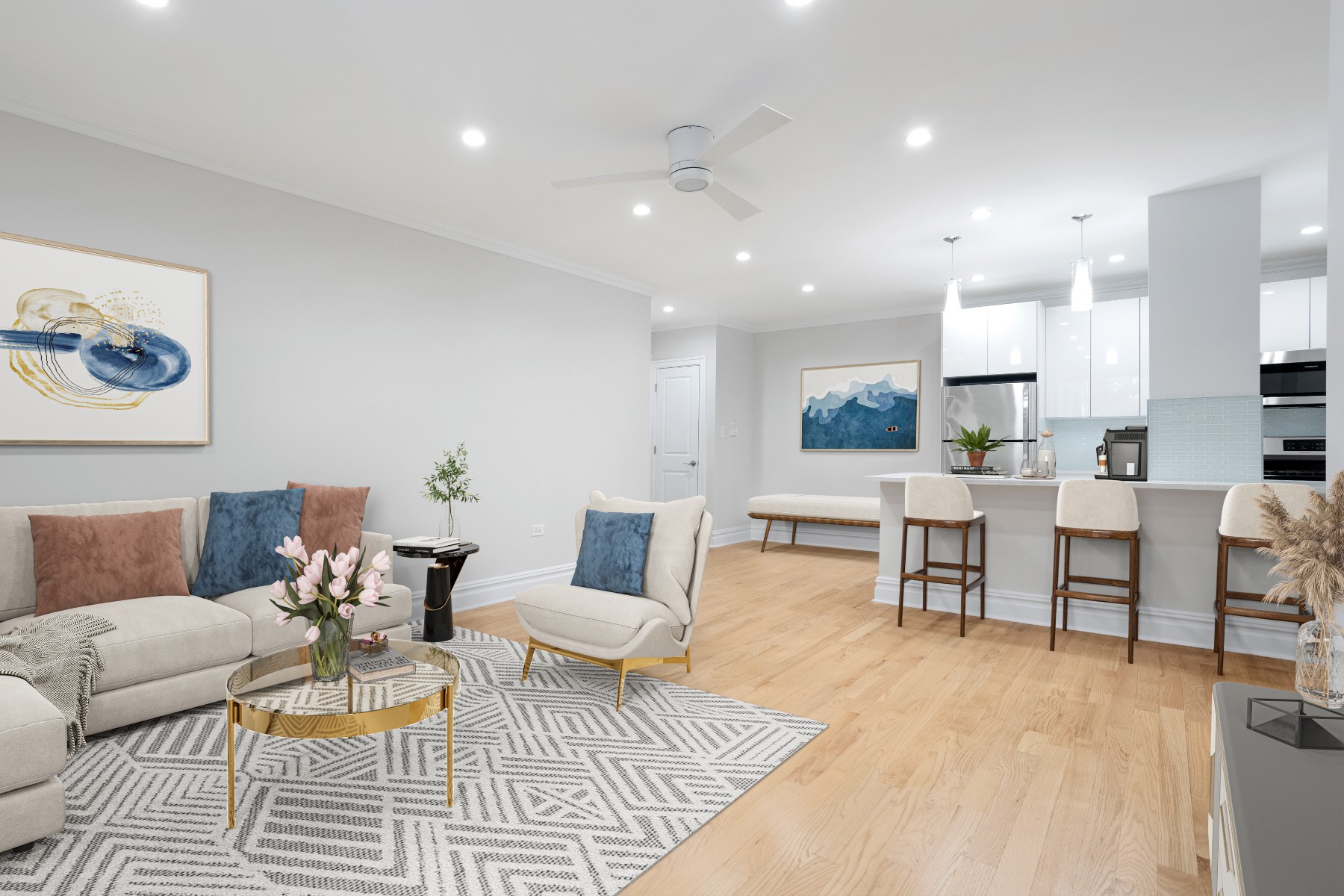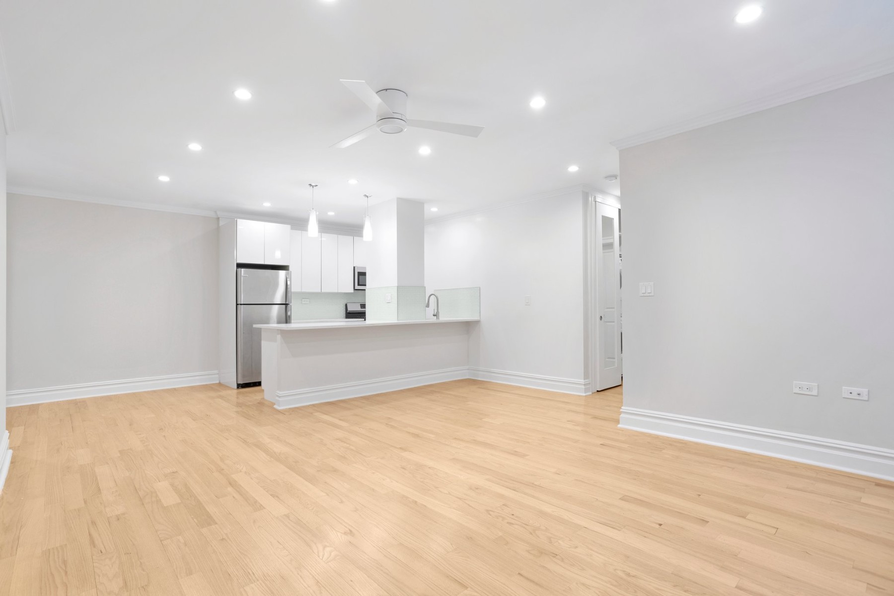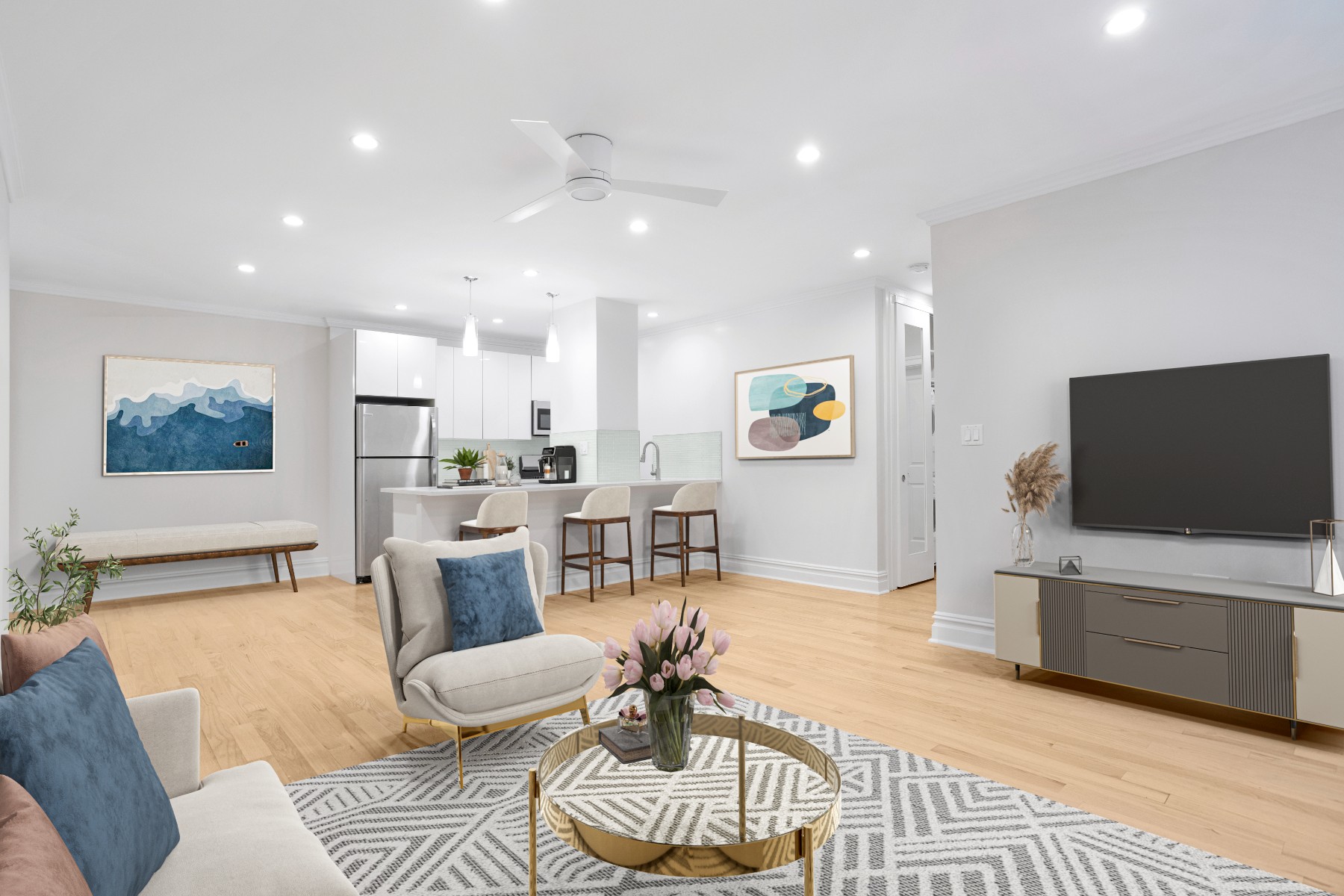 As you enter, youll be greeted by an open-concept design that seamlessly combines the kitchen and living room, creating the perfect space for entertaining guests or relaxing with loved ones. Near the entrance is a nook perfect for a home office or a cozy breakfast table. The recessed lighting throughout illuminates the space, highlighting its beauty and providing a warm and inviting atmosphere. Additionally, each room features a remote control fan, allowing you to easily adjust the airflow and maintain a comfortable environment.